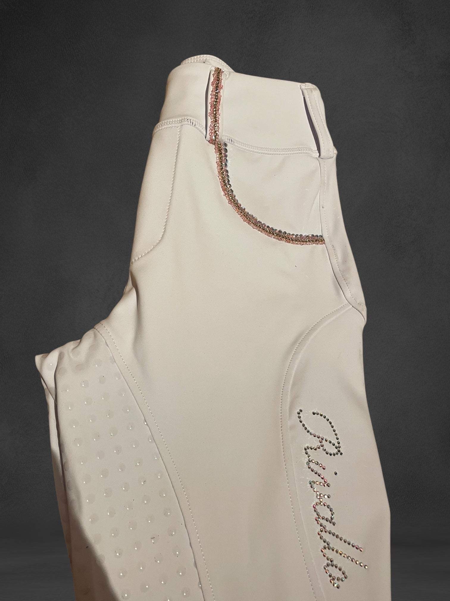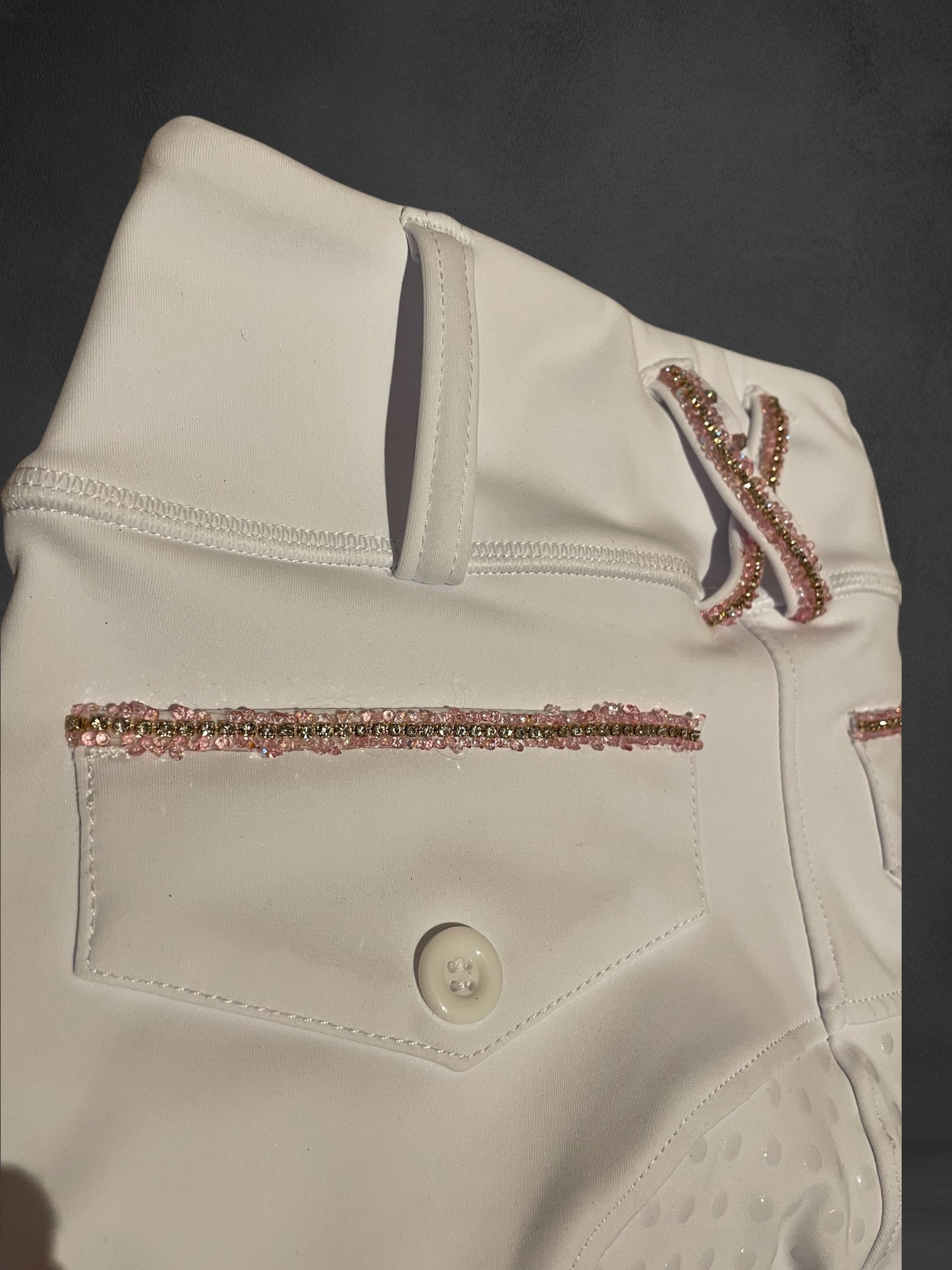 Tjock tights modell med ”fuskfickor” bak med blingade fickor och skärphällor. Vita med logga på benet.